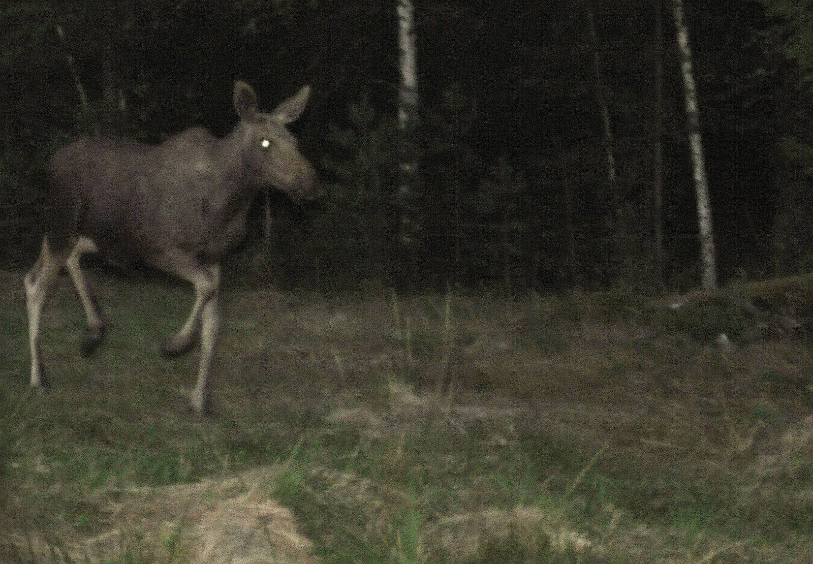 Like etter hørte jeg en masse brasing der bukken forsvant i skogen og denne elgkua kom løpende nesten rett på meg. Tok et kjapt bilde med blitz, elgen tverrvendten og løp som en gal tilbake i samme retning den kom fra.